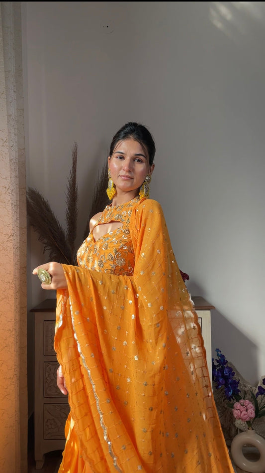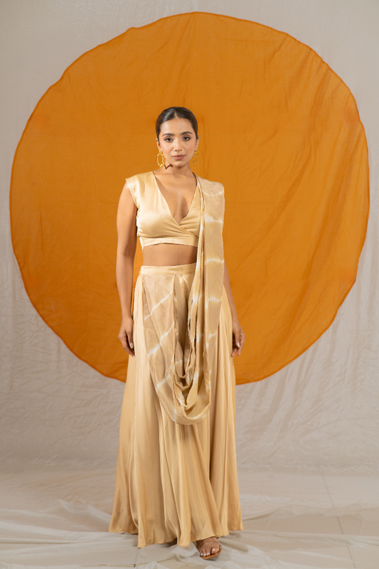Beige Draping Plazzo Set with Organza Jacket and Dupatta