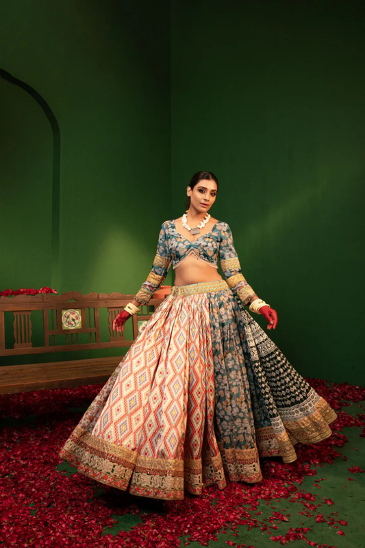 Designer Silk Lehenga Set: Shaded Elegance, Ikat Blouse, Vibrant Dupatta