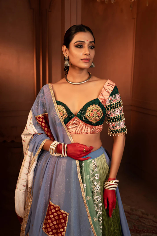 Devi Blue Orchid Lehenga in Raw Silk & Crepe
