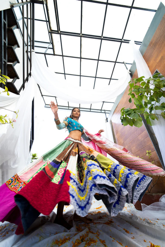 Handcrafted Multicolored Lehenga with Ikat Blouse & Bandhani Dupatta