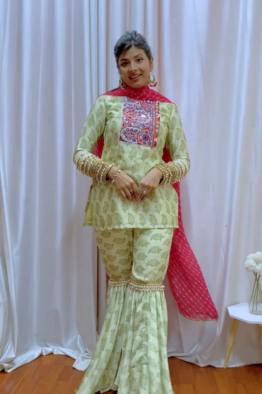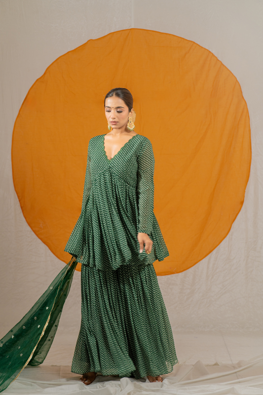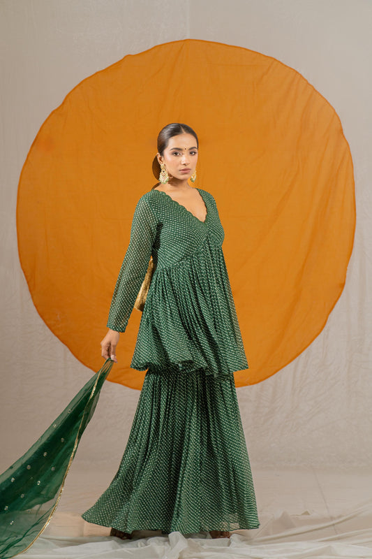 Green Printed Kurta Sharara Set with Bandhani Dupatta and Exquisite Mirror Work
