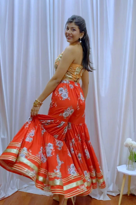 Red Silk Blouse & Net Worked Sharara With Feather Dupatta