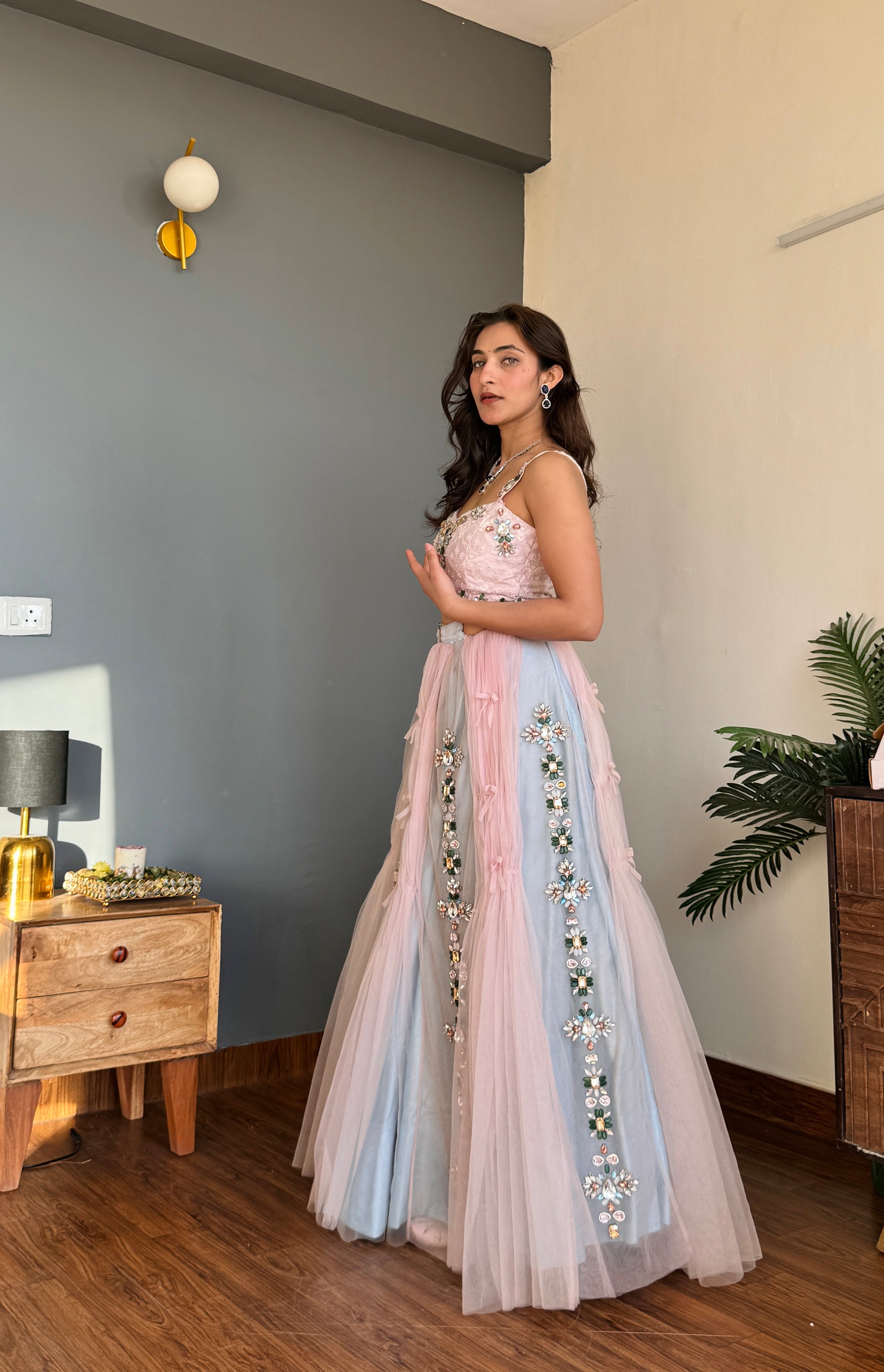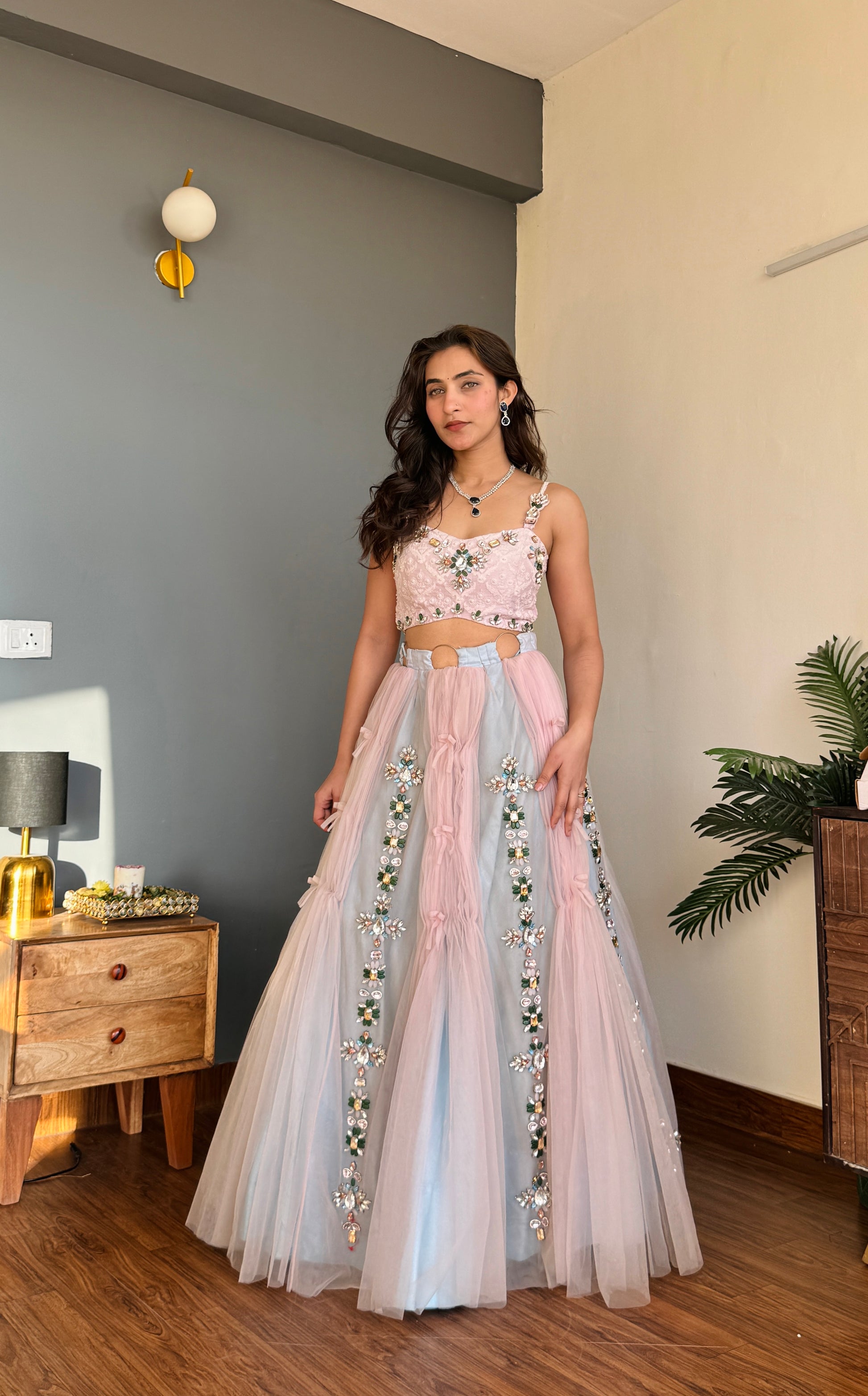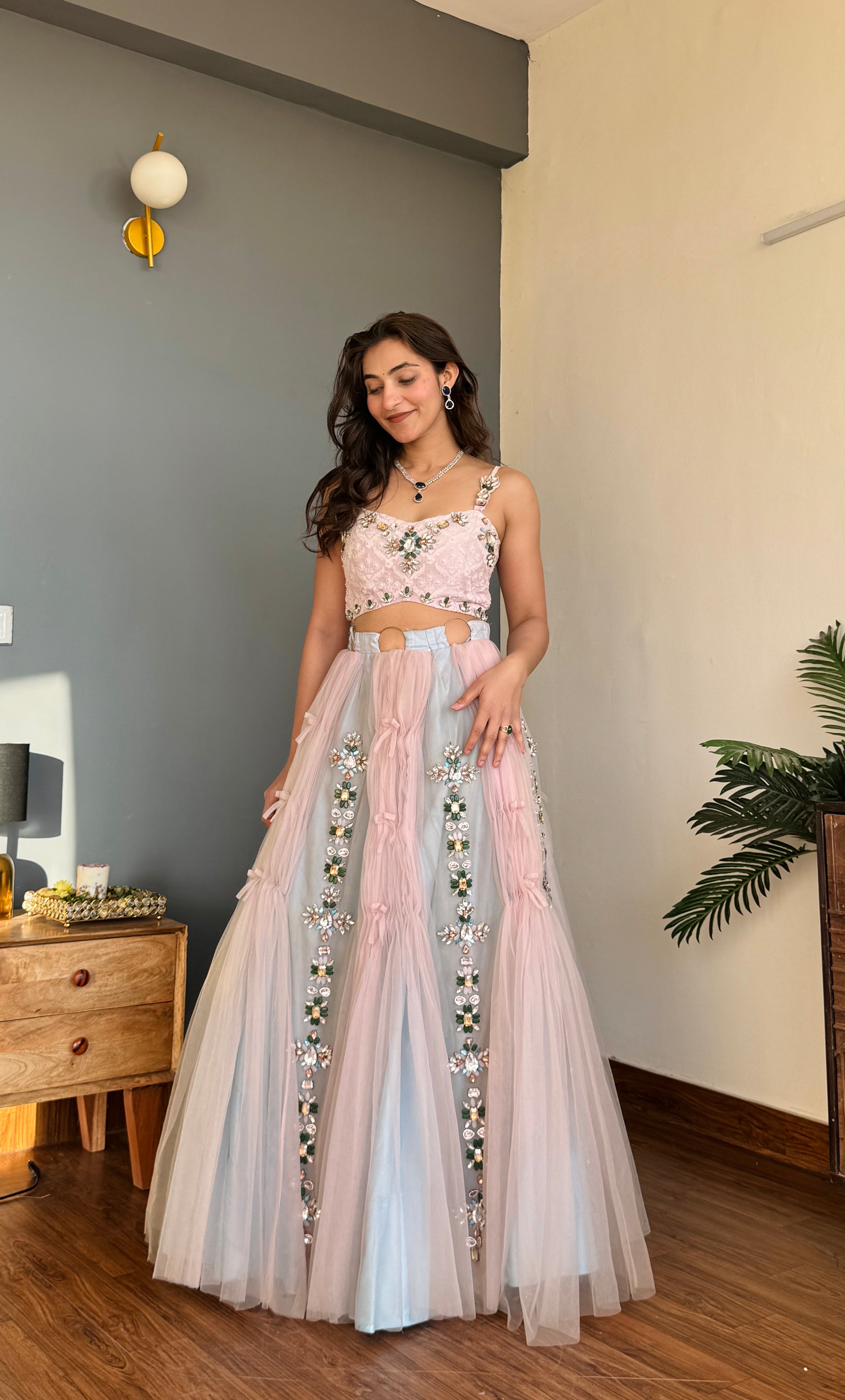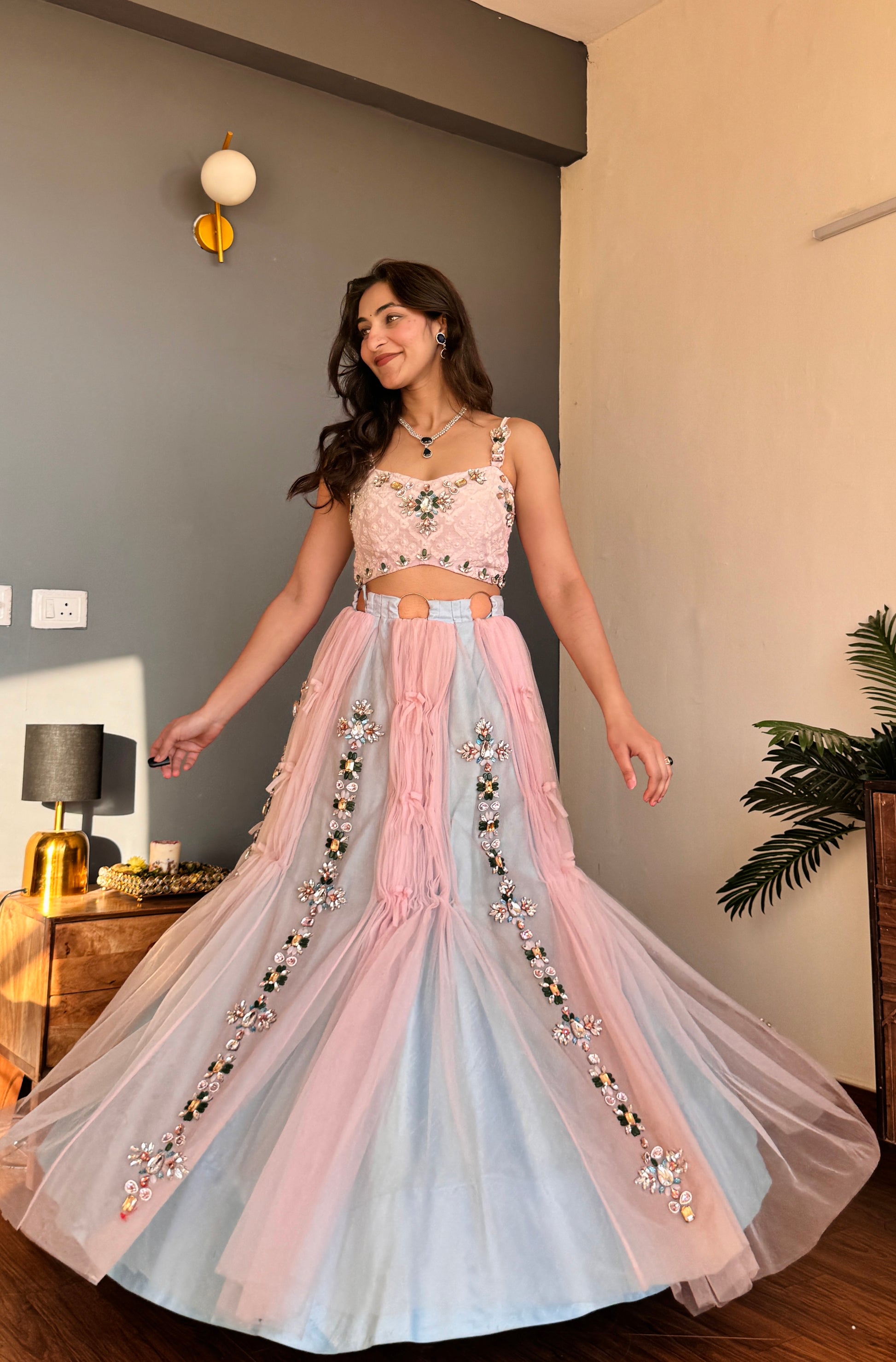 The Celeste Bloom Ombre Crop Top Lehanga is a modern couture ensemble crafted for elegant celebrations. The silk crop top is delicately embellished to add refined glamour, while the net lehanga skirt flows beautifully with a soft ombre effect. Floral and crystal detailing enhance the silhouette, creating graceful movement and a luxurious finish. Ideal for cocktail nights, sangeet functions, destination weddings, and statement evenings.