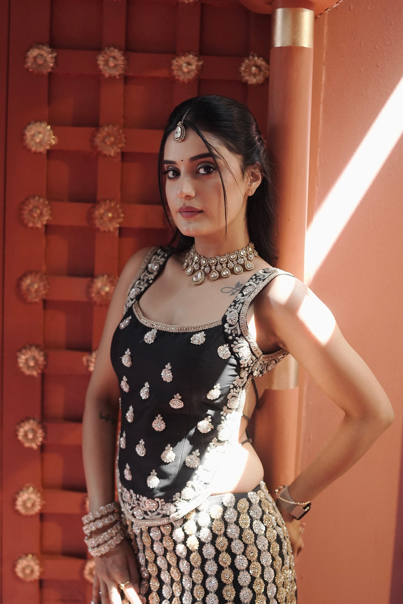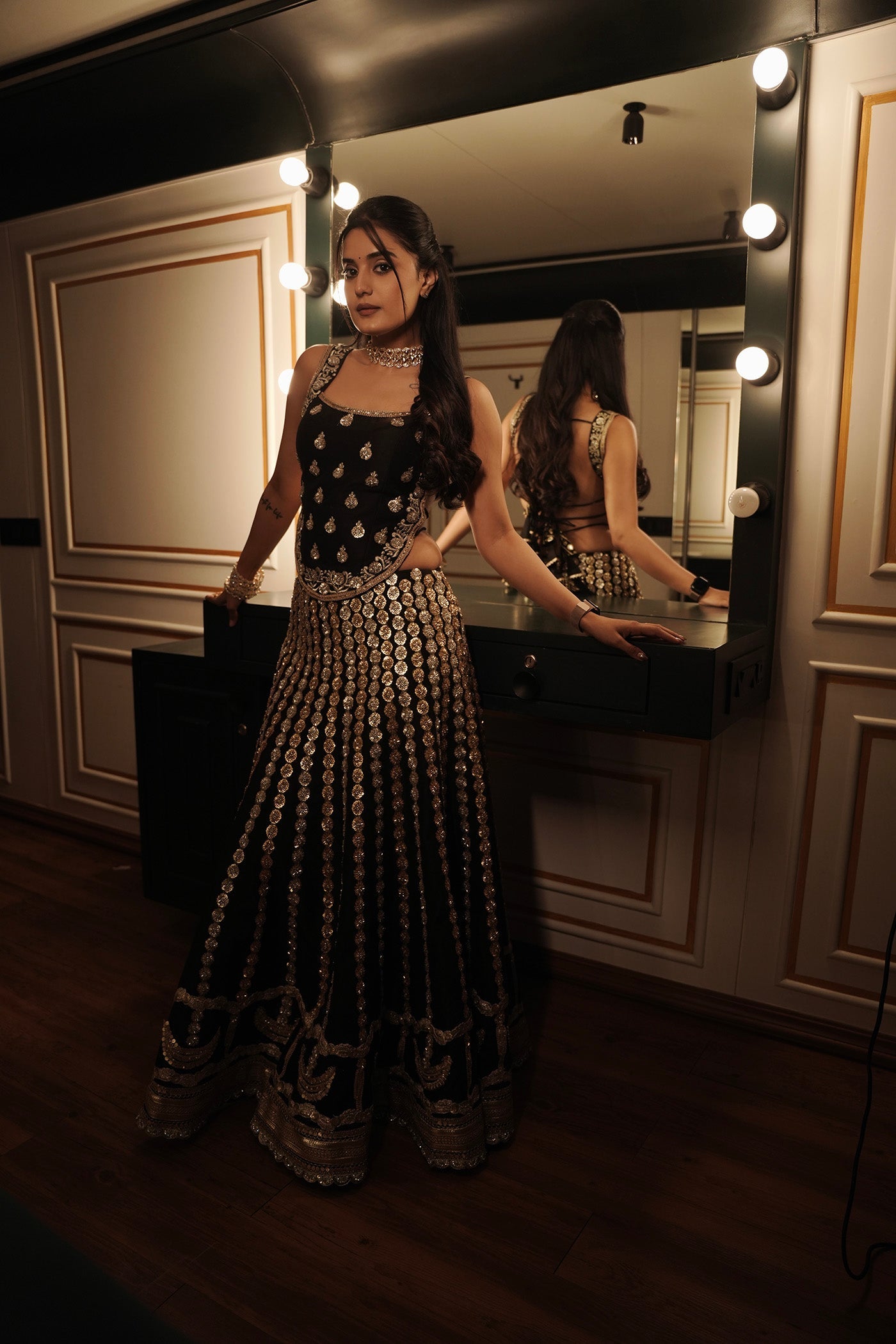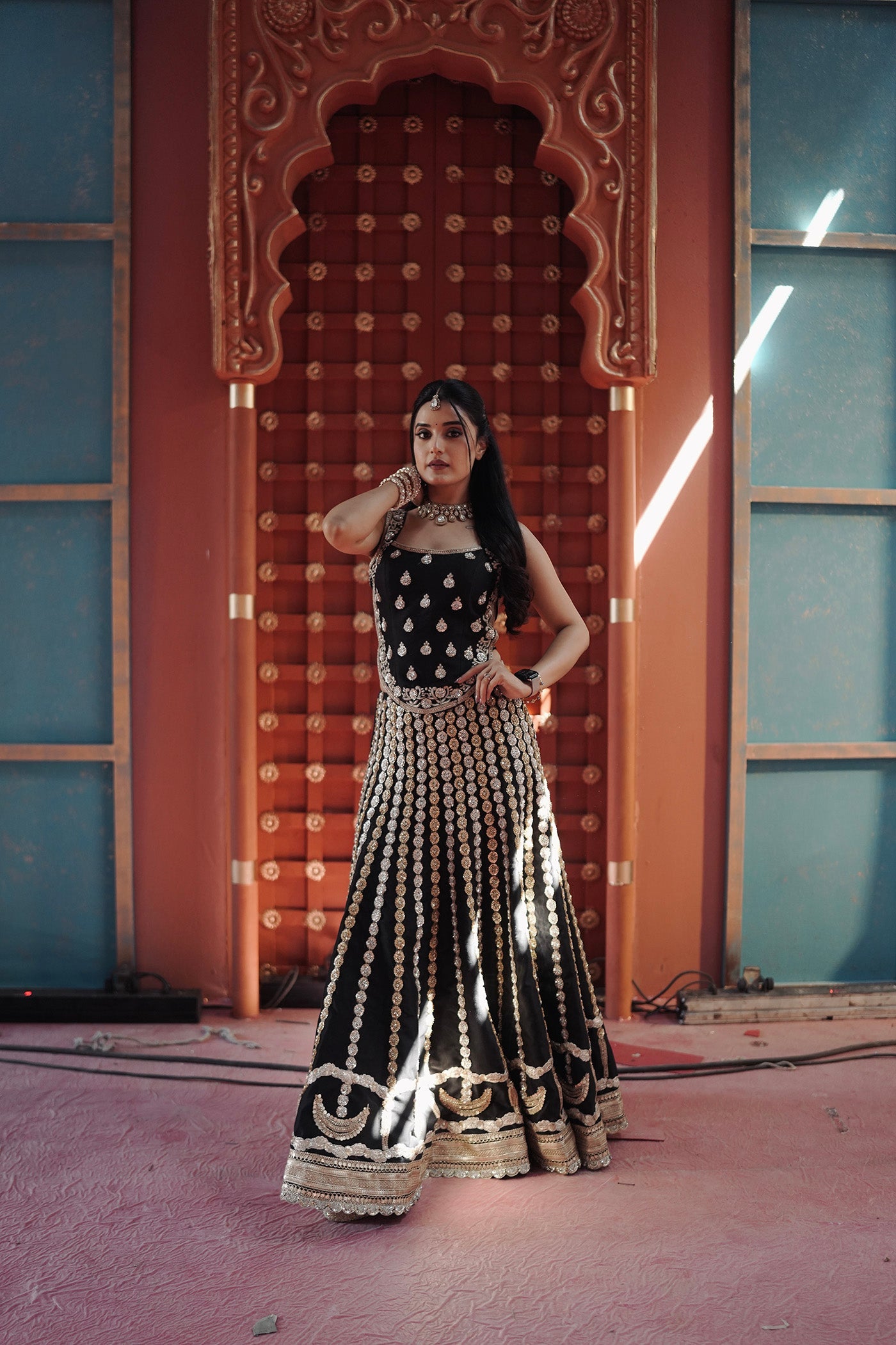 A striking blend of bold femininity and timeless craftsmanship, this black and gold lehenga set is designed for the modern muse. The structured blouse with delicate embellishments and statement back detailing pairs effortlessly with a richly embroidered lehenga, creating a silhouette that is both powerful and elegant. Perfect for cocktail nights, receptions, and high-glam occasions, this ensemble captures attention with every movement.