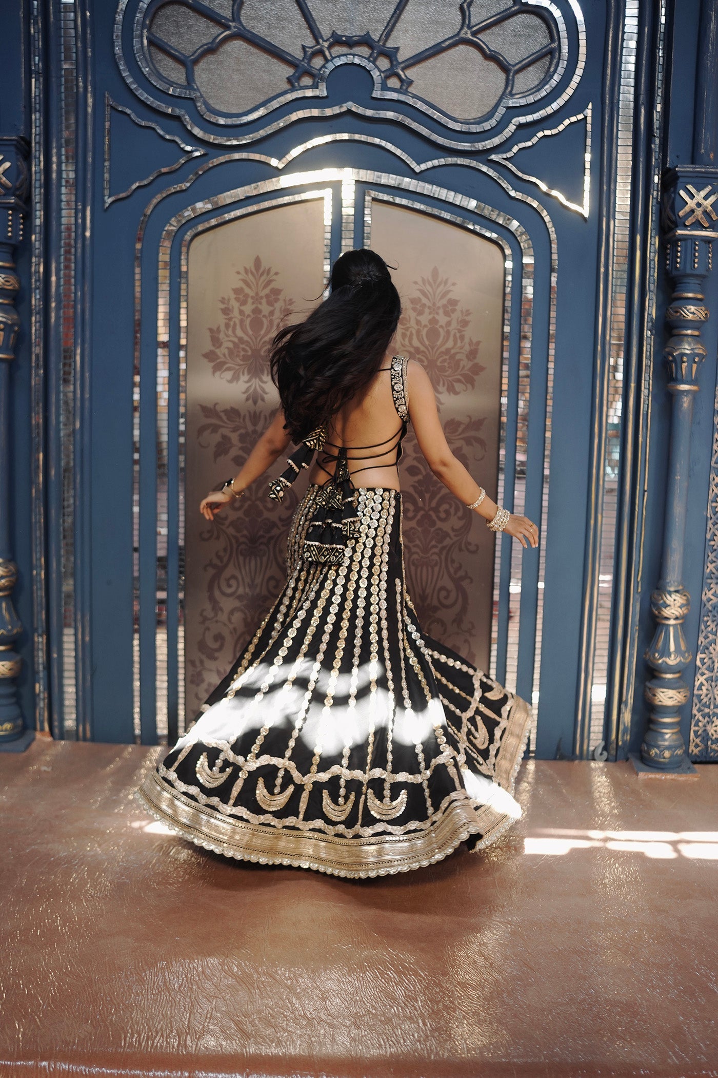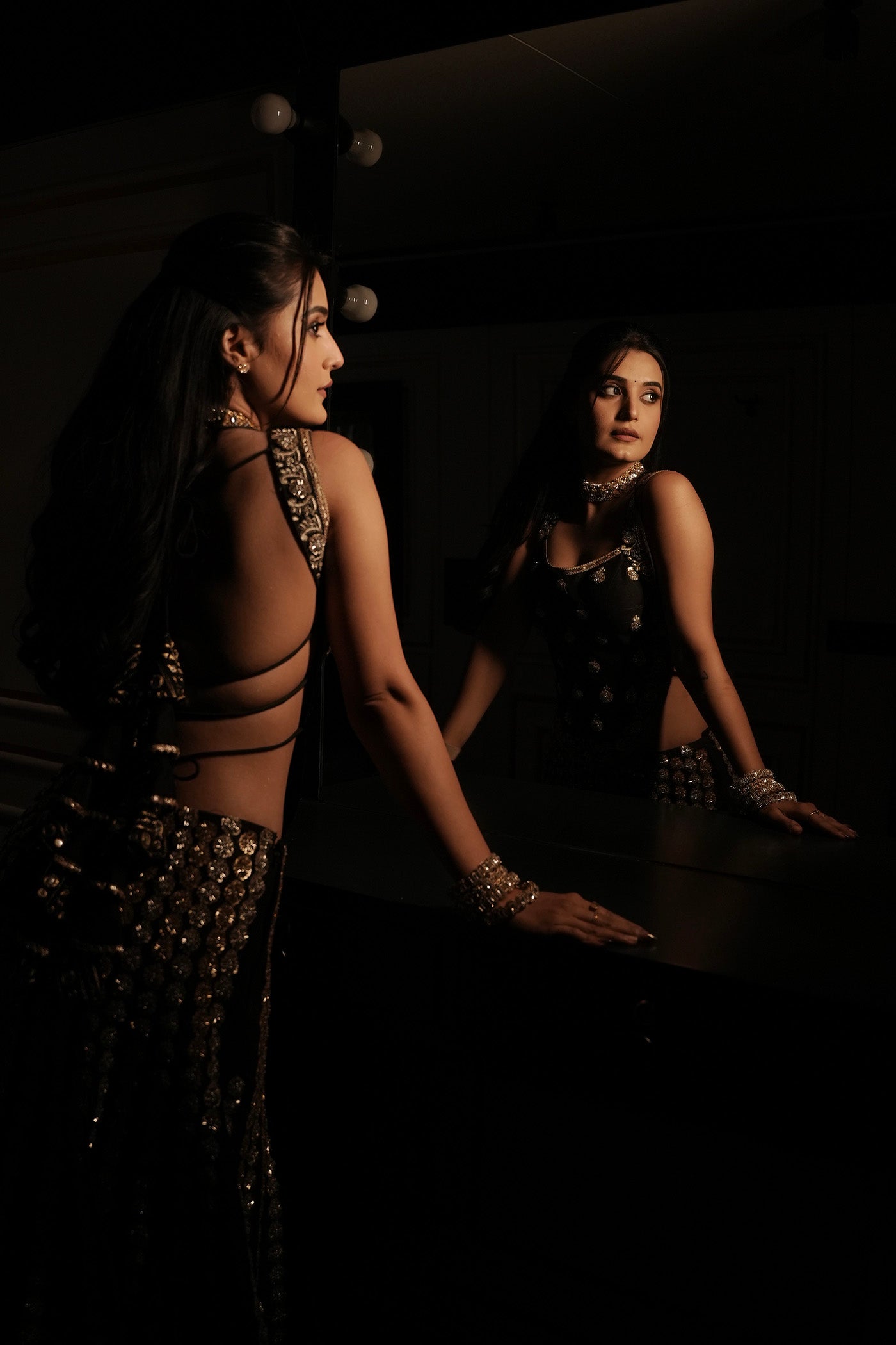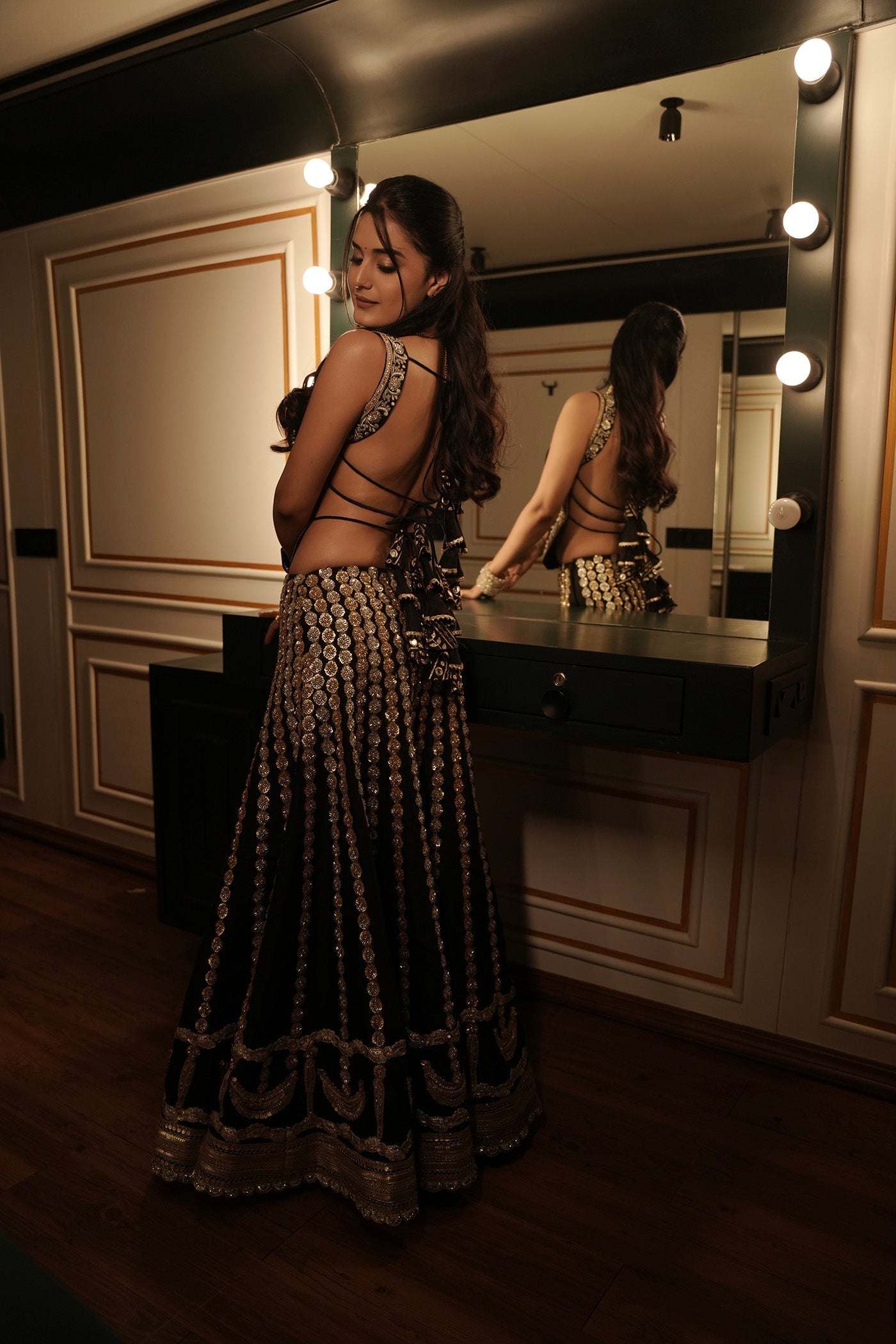 A striking blend of bold femininity and timeless craftsmanship, this black and gold lehenga set is designed for the modern muse. The structured blouse with delicate embellishments and statement back detailing pairs effortlessly with a richly embroidered lehenga, creating a silhouette that is both powerful and elegant. Perfect for cocktail nights, receptions, and high-glam occasions, this ensemble captures attention with every movement.