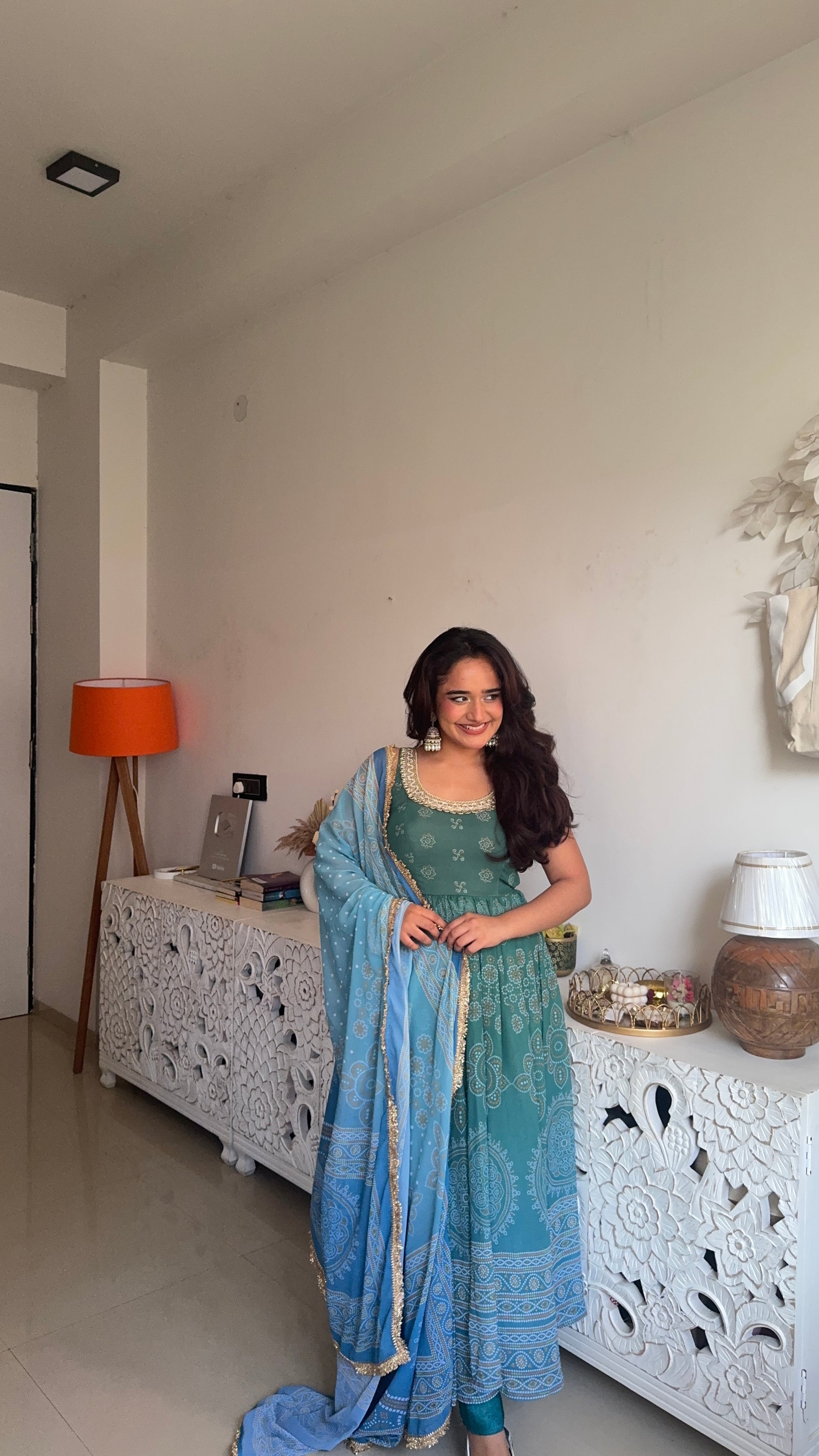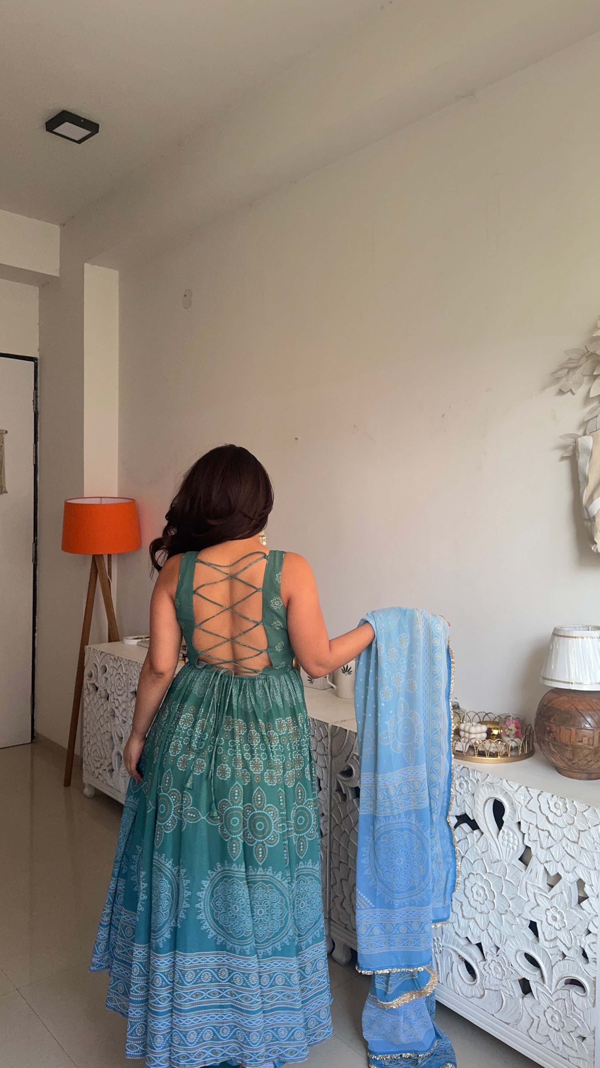 Refresh your festive wardrobe with our Neelaya Green Printed Anarkali Set, crafted in flowy Georgette and designed in a beautiful blend of emerald green and powder blue hues. Featuring delicate traditional prints, a graceful flared silhouette, and a stylish lace-up back detail, this Anarkali is paired with a soft contrasting dupatta that completes the look elegantly.
