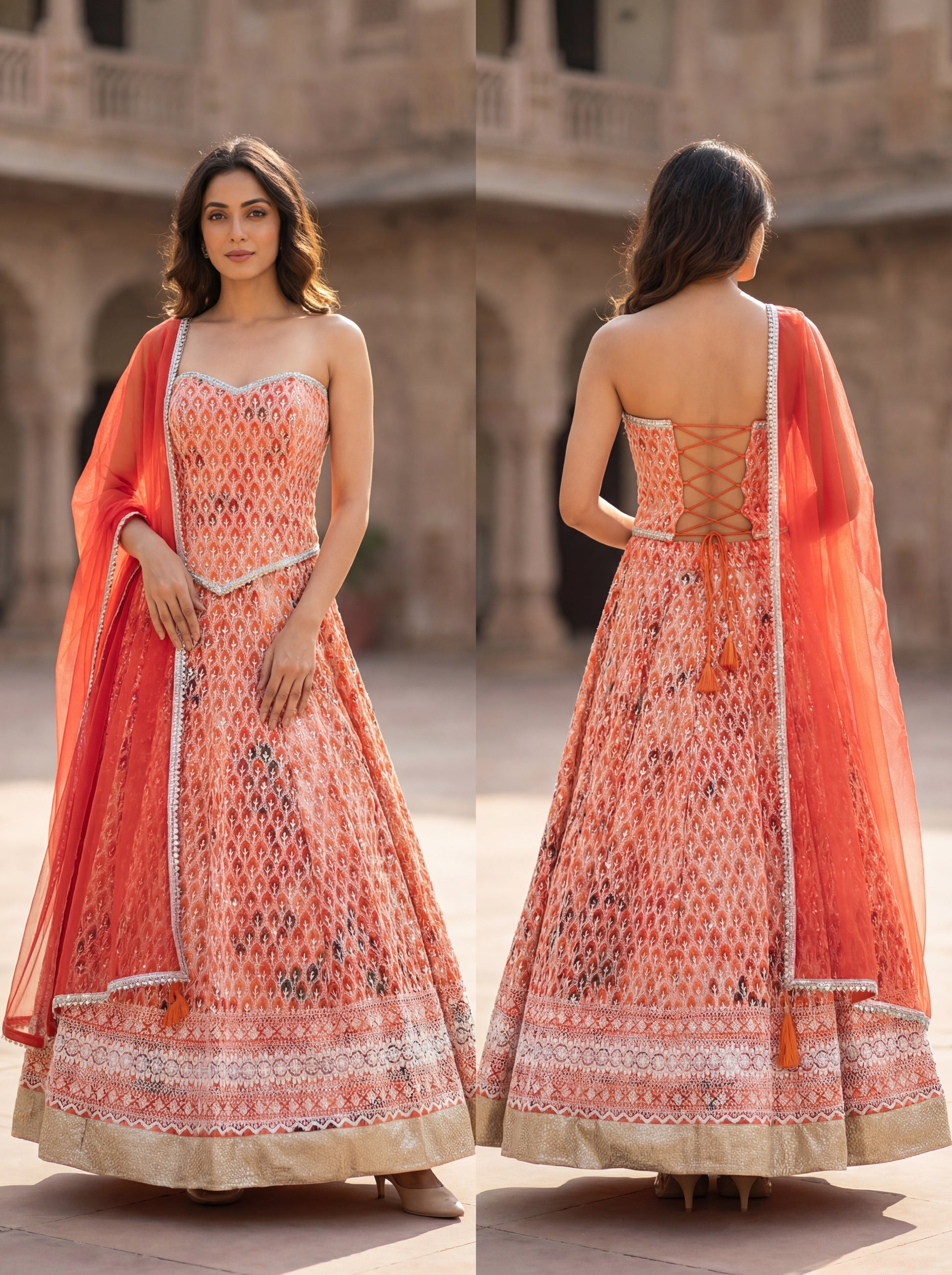 Perfect for wedding functions, receptions, festive evenings, and grand celebrations, this outfit is designed for women who love elegance, drama, and timeless style.