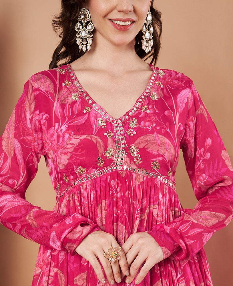 Rose Digital Kurta Palazzo is made of lightweight chiffon. The digital print adds soft floral or abstract patterns. The kurta is loose, so it moves easily with you. The palazzo pants are roomy and let air pass. The pink tone makes it look fresh yet calm. You can wear this to casual events, family meetings, or festivals. Pair with sandals or flats. Just small earrings finish the look.